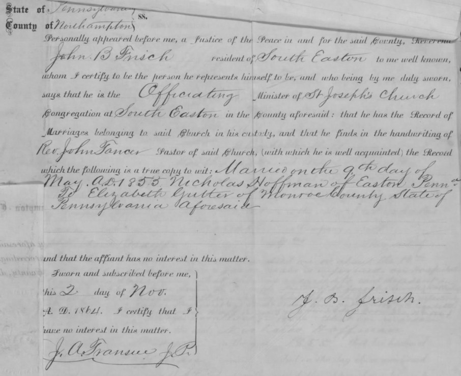 Rev. Frisch’s 2 November 1864 Attestation re Nicholas Hoffman’s Widow and Children, p. 2