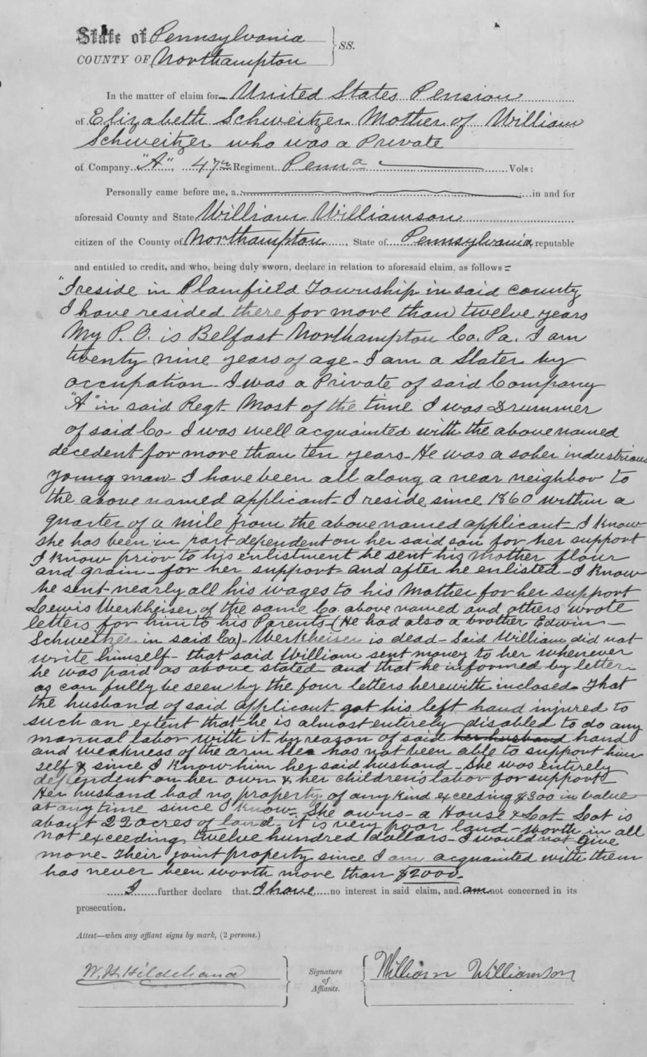 I reside in Plainfield Township in said county [Northampton County]. I have resided there for more than twelve years. My P. O. is Belfast Northampton Co. Pa. I am twenty nine years of age. I am a Slater by occupation. I was a Private of said Company ‘A’ in said Regt. [the 47th Pennsylvania Volunteer Infantry]. Most of the time I was Drummer of said Co. I was well acquainted with the above named decedent [William Schweitzer] for more than ten years. He was a sober industrious young man. I have been all along a near neighbor to the above named applicant [Elizabeth Schweitzer]. I reside since 1860 within a quarter of a mile from the above named applicant. I know she has been in part dependent on her said son for her support. I know prior to his enlistment he sent his mother flour and grain for her support and after he enlisted. I know he sent nearly all his wages to his mother for her support. Lewis Werkheiser of the same Co. above named and others wrote letters for him to his Parents. (He had also a brother Edwin Schweitzer in said Co.) Werkheiser is dead. Said William did not write himself that said William sent money to her whenever he was paid as above stated, and that he informed by letter as can fully be seen by the four letters herewith inclosed [sic. Enclosed]. That the husband of said applicant got his left hand injured to such an extent that he is almost entirely disabled to do any manual labor with it by reason of said her husband hand and weakness of the arm. He has not been able to support himself since I know him her said husband. She was entirely dependent on her own & on her children’s labor for support. Her husband had no property of any kind exceeding $300 in value at any time since I know. She owns a House and Lot. Lot is about 22 acres of land—it is very poor land—worth in all not exceeding twelve hundred dollars. I would not give more. Their joint property since I am acquainted with them has never been worth more than $2000.