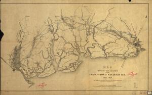 This 1856 map of the Charleston & Savannah Railroad shows the island of Hilton Head, South Carolina in relation to the towns of Beaufort and Pocotaligo (U.S. Library of Congress, public domain).