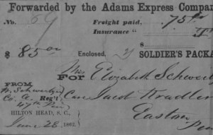 That she was in part supported by her said son William Schweitzer, prior to his enlistment in said Company ‘A’ and thereafter, that she received three packages of money from him forwarded by Adams Express Company. The Envelopes of two of the packages one of them containing $30, dated Beaufort SC Oct. 21, 1862, and the other Hilton Head S.C. June 28th 1862 for $85 are hereto annexed and that other package was sent to Frederick Seitz of Easton aforesaid. She also declared that she has not in any way been engaged in, or aided or abetted the rebellion in the United States, that she is not in the receipt of a pension under the 2d section of the [various pension laws]. That her Post Office is Belfast Northampton County Penna.