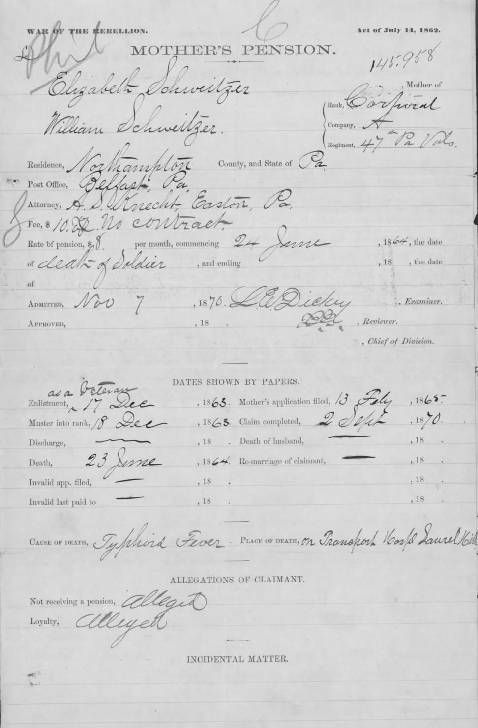 - Neighbors Levi Steinmetz and Richard Russell “testified that her husband [was] intemperate to such an extent, that he [did] not give any support to his family, and [was] an annoyance, trouble, and expense to them,” adding that “the claimant [Elizabeth Schweitzer] owns a house and small lot of land which does not exceed $1000 in value.” They also stated that her husband, Thomas, owned no land of his own, and said the couple had “no other means of support” at that time, adding that their son, Private William Schweitzer of the 47th Pennsylvania Volunteers, had previously supported the couple on his wages before enlisting with that regiment and then continued that support during the war until he died in service to the nation.