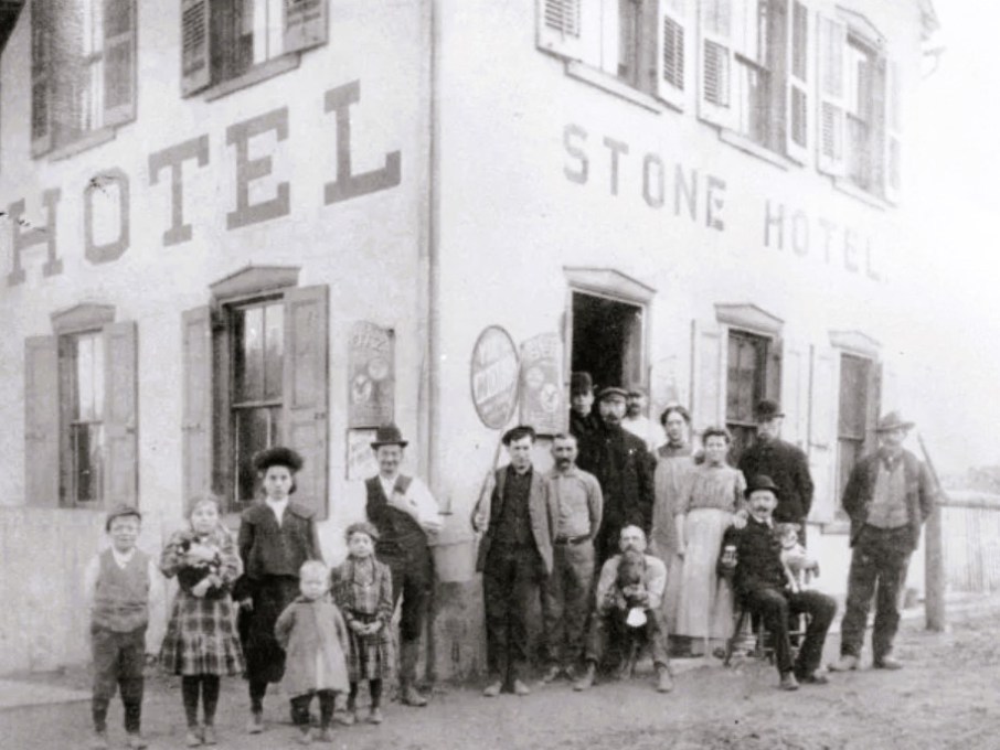 Crowd gathered outside of the Old Stone Hotel operated by Peter Schweitzer in Glendon, Pennsylvania, circa 1900 (public domain).