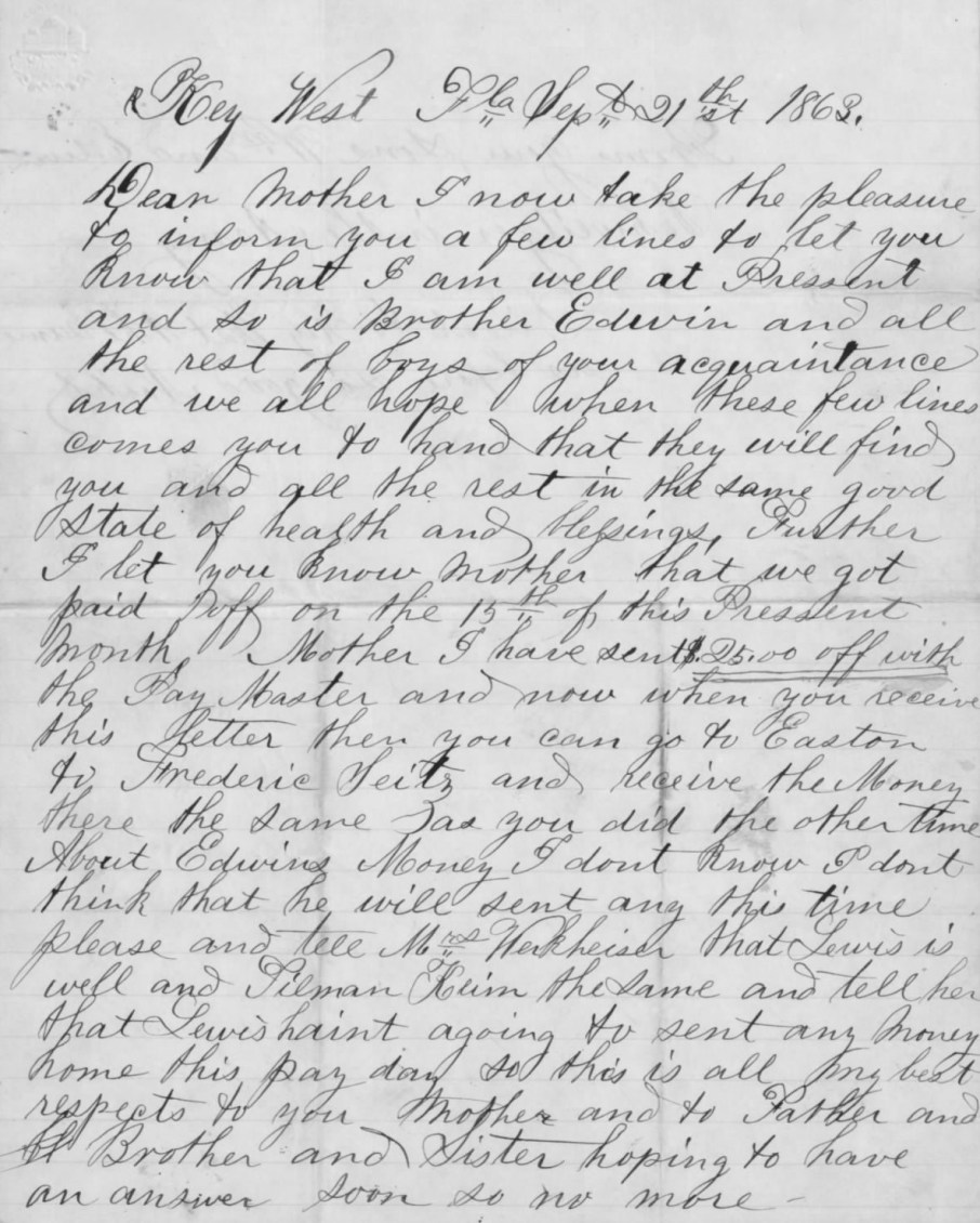 Excerpt of a letter sent by Corporal William Schweitzer, Company A, 47th Pennsylvania Volunteers, to his parents on September 1, 1863 (U.S. Civil War Mother’s Pension File of Elizabeth Schweitzer, U.S. National Archives and Records Administration, public domain).