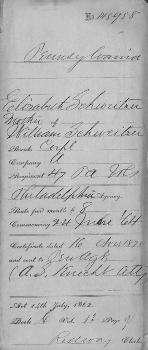 Elizabeth Schweitzer’s U.S. Civil War Mother’s Pension Award and Amount, 16 Nov 1870_pubdom