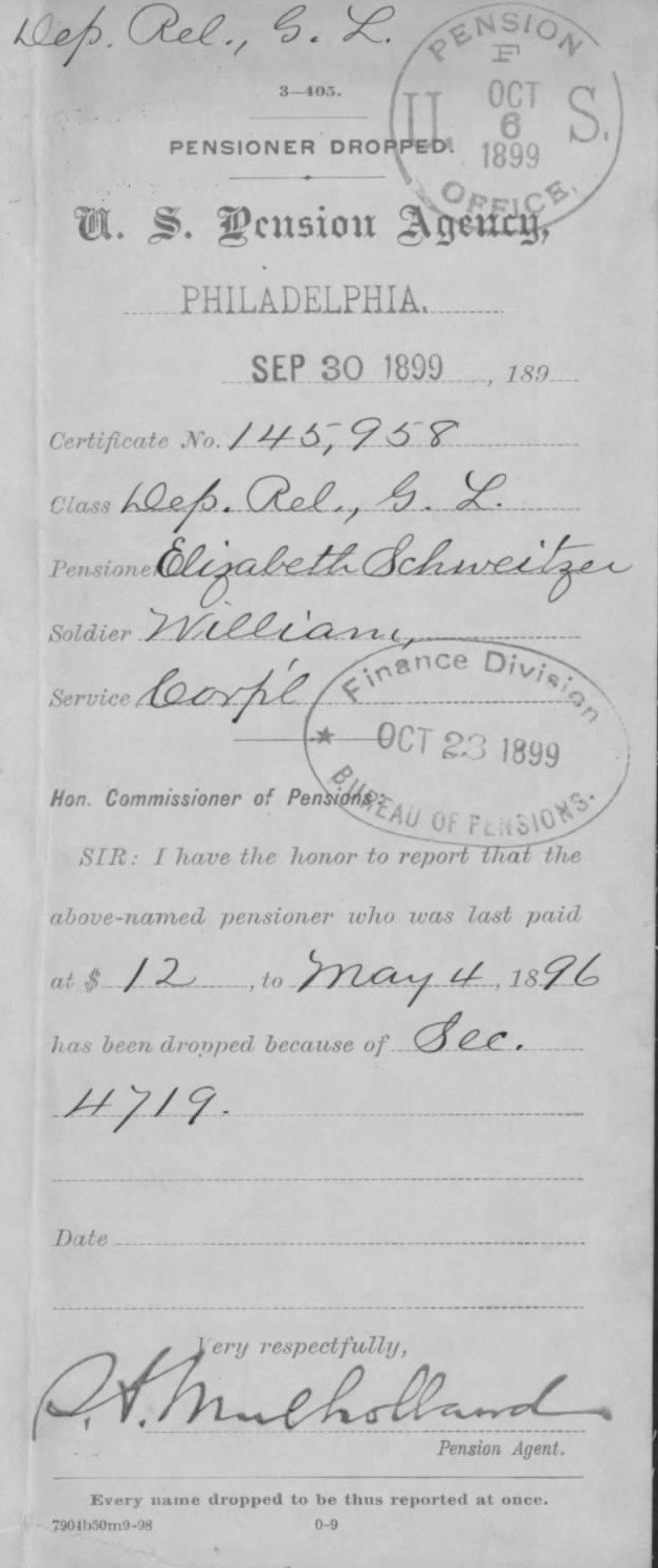 Elizabeth Schweitzer’s U.S. Civil War Mother’s Pension Claim_Claim History, Pensioner Dropped 1899
