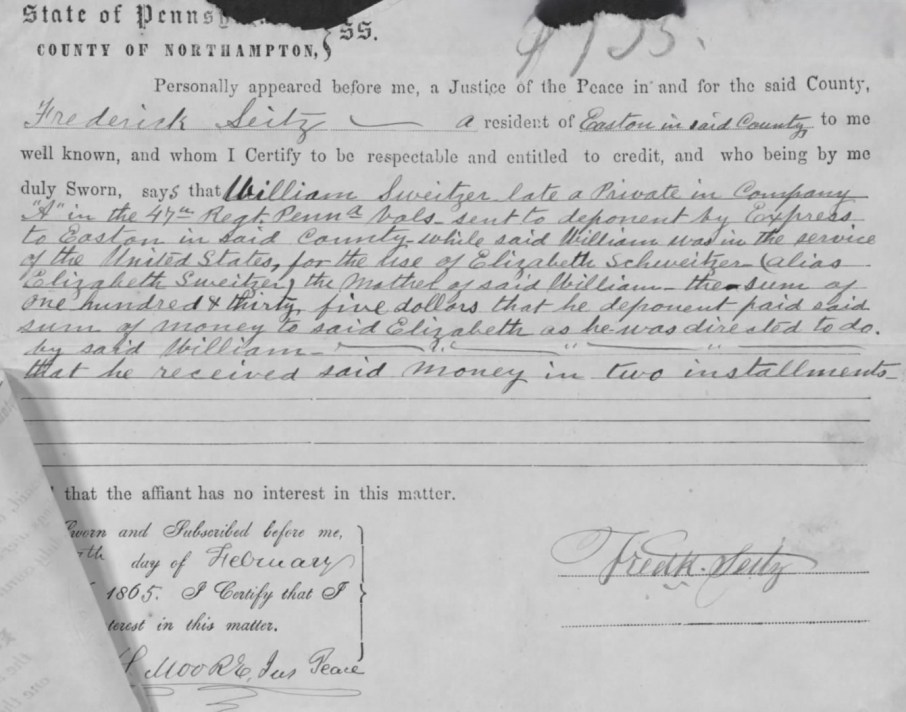 Elizabeth Schweitzer’s U.S. Civil War Mother’s Pension Claim_Frederick Seitz’s 8 Feb 1865 Affidavit_pubdom