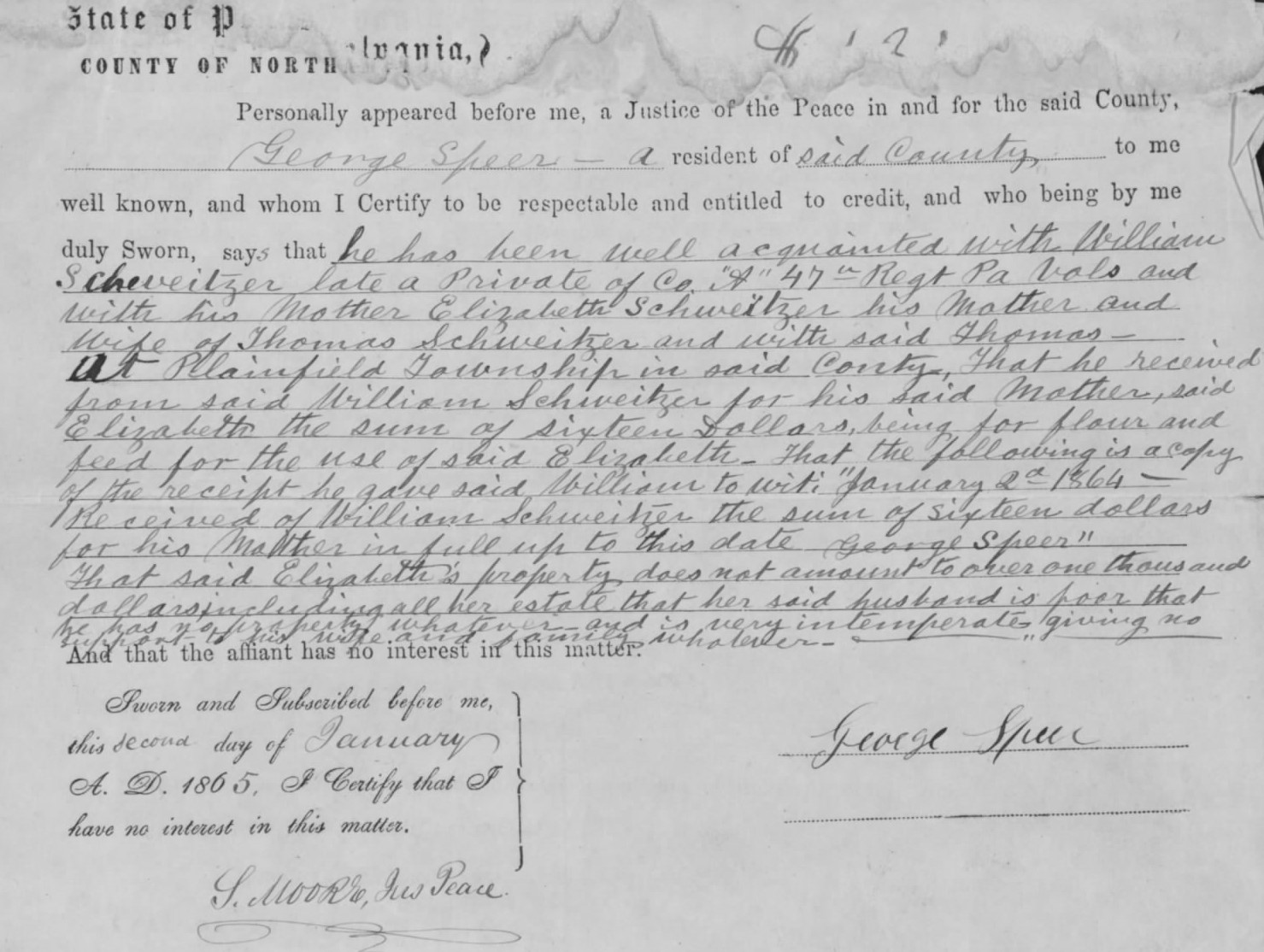 Elizabeth Schweitzer’s U.S. Civil War Mother’s Pension Claim_George Speer Affidavit, 2 January 1865