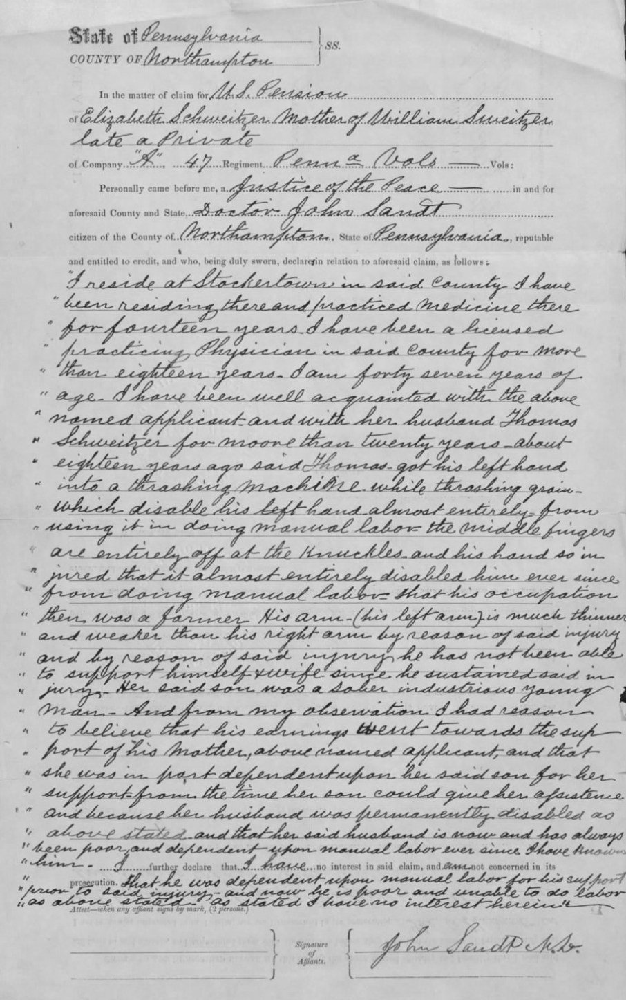 Elizabeth Schweitzer’s U.S. Civil War Mother’s Pension Claim_Physician’s Affidavit, 20 Apr 1870, pp. 1-2