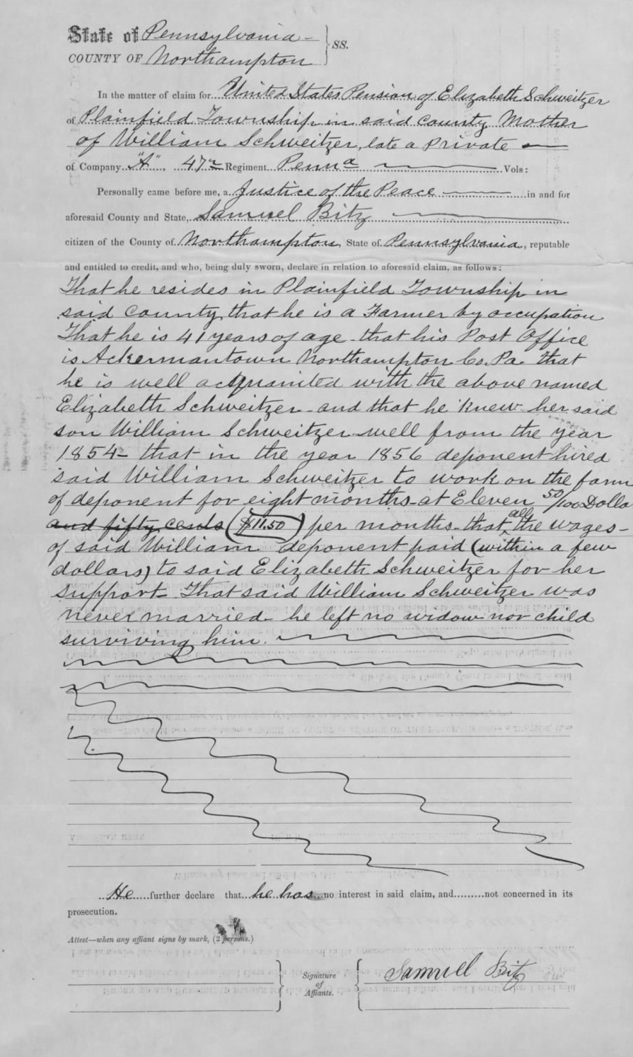 Elizabeth Schweitzer’s U.S. Civil War Mother’s Pension Claim_William Bitz Affidavit, 19 Aug 1870, pp. 1-2_pubdom, p. 1