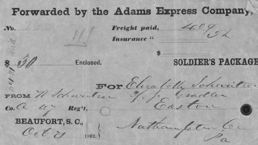 Receipt Received by Corporal William Schweitzer, 21 October 1862 for Money Transfer to His Parents (U.S. Civil War Mothers’ Pension Files, U.S. National Archives and Records Administration, public domain).