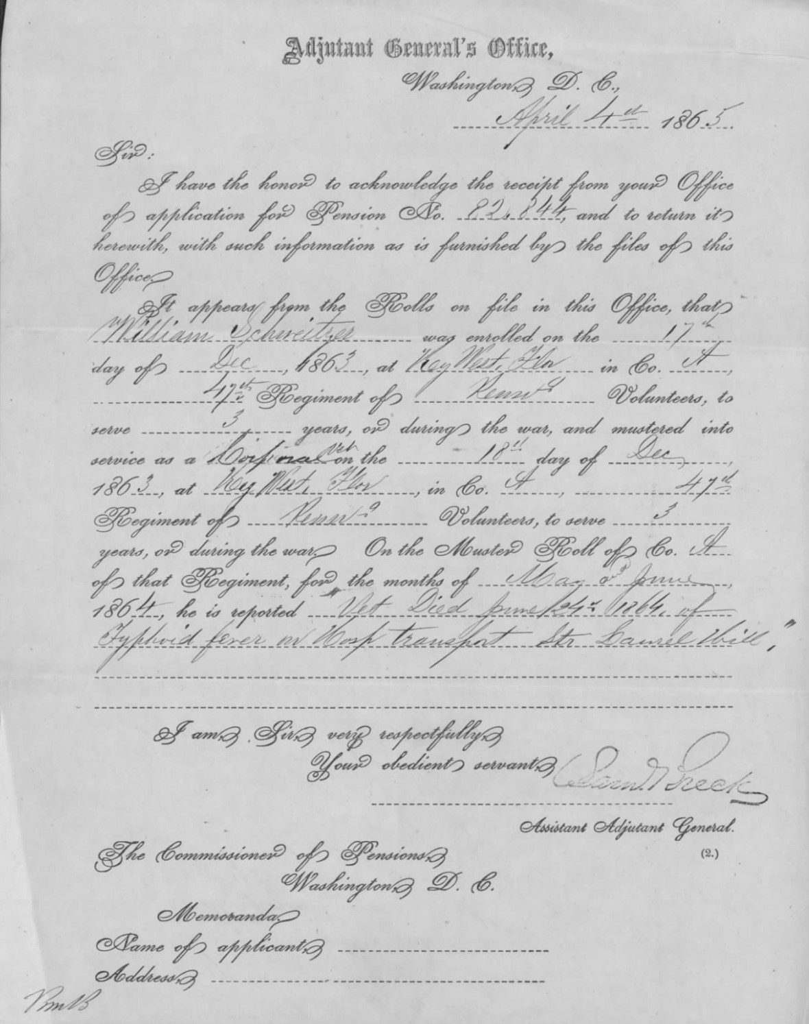 Confirmation by the U.S. Adjutant General, 4 April 1865, of the 1864 Death of Corporal William Schweitzer Aboard the USS Laurel Hill (U.S. Civil War Mothers’ Pension Files, U.S. National Archives and Records Administration, public domain).