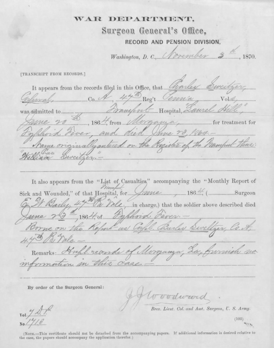U.S. Surg. Gen.’s 3 Nov 1870 Confirmation of William Schweitzer’s 1864 USS Laurel Hill Death_pubdom