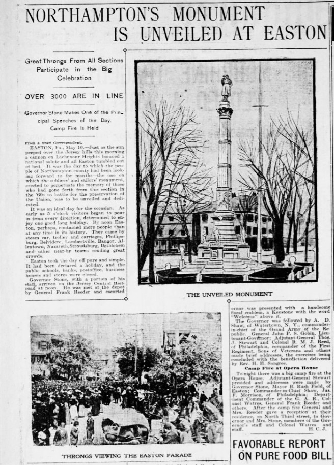 “Northampton’s Monument Is Unveiled at Easton” (The Philadelphia Inquirer, 11 May 1900, public domain; click to enlarge).