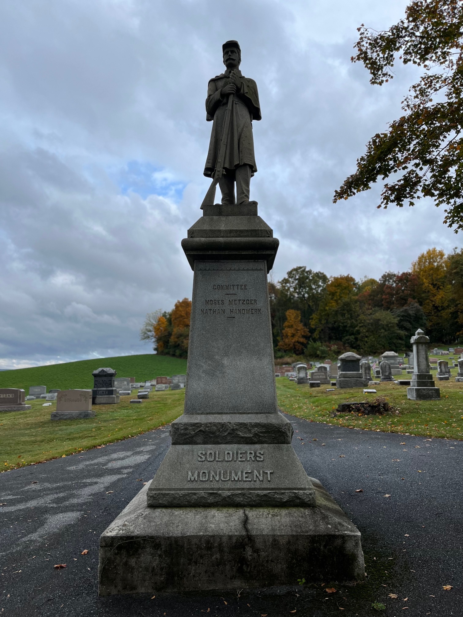 Moses Metzger and Nathan Handwerk spearheaded the drive to erect this Soldiers’ Monument at the Heidelberg Union Cemetery (photo used with permission, courtesy of Stacy Shiffert; click to enlarge).