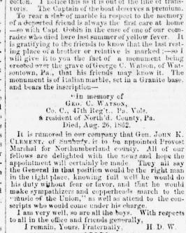 Included in this letter home was the notice of the death and interment of 47th Pennsylvania Volunteer George Watson. Published in the Sunbury American, 30 May 1863. (Click on images for enlarged view. Click HERE for full transcript.)