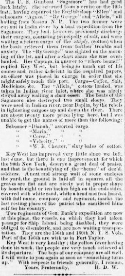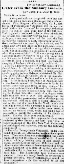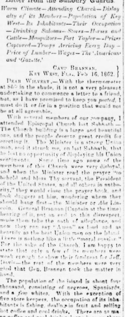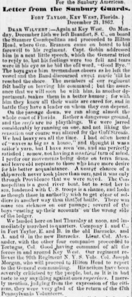 This letter penned by Henry D. Wharton at the close of the second year of America’s Civil War documents the departure of Brigadier-General John M. Brannan from his command role at Fort Taylor in Key West, Florida. Published in the Sunbury American, 10 January 1863. (Click on images of this letter for enlarged view. Click HERE for full transcript of the entire letter.)