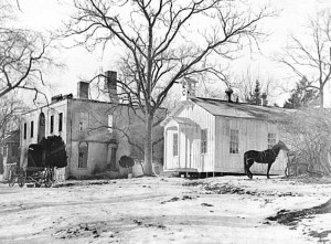 The Kalorama Eruptive Fever Hospital (also known as the Anthony Holmead House in Georgetown, D.C.) was the 1861 death site of Drummer Boy John Boulton Young, the first 47th Pennsylvania Volunteer to die in service (shown here after the hospital was destroyed during a Christmas Eve fire, U.S. Library of Congress, public domain).