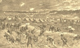Alfred Waud’s 1864 sketch, “Surprise at Cedar Creek,” captured the flanking attack on the rear of Union Brigadier-General William Emory’s 19th Corps by Lieutenant-General Jubal Early’s Confederate army, and the subsequent resistance by Emory’s troops from their rifle pits, 19 October 1864 (public domain).