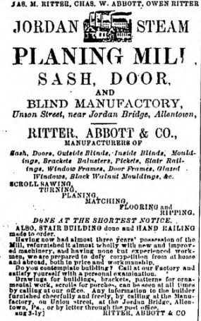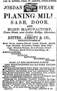In 1870, Charles W. Abbott resided with his wife, Emma, and their sons, William and Harry, in the Second Ward of Allentown, where he co-owned and operated Ritter, Abbott & Co., a planing mill and home improvement supply manufacturing firm which made use of his years of carpentry experience (see newspaper advertisement at right). Also living with them at this time was Charles Abbott’s mother-in-law, Charlotte Mathias. That year’s federal census taker valued the real estate and personal estate of Charles Abbott at $4,000 and $3,200, respectively (roughly the equivalent of $150,000 in 2021).
