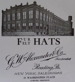 * Note: G. W. Alexander’s son, Edgar W. Alexander, continued to operate the family’s hat factory after his father’s passing. After incorporating in 1905, he sold the factory to Philadelphia businessmen in 1912. Renamed the “Reading Hat Factory,” it became known for its manufacture of Boy Scout, cowboy, military and other stiff hats—a few of which may be found as collectibles at various auction sites.