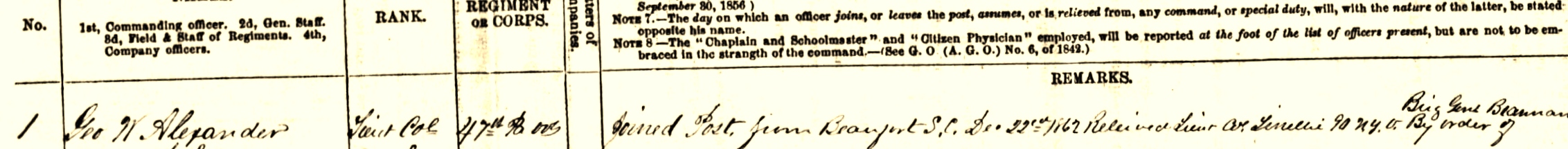 Excerpt from 47th PA Volunteers’ Civil War muster roll documenting Brig.-Gen. J. M. Brannan’s directive for Lt.-Col. G. W. Alexander to assume command of Fort Jefferson, Dry Tortugas, Florida, December 1862.