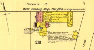 An 1887 fire insurance map produced by the Sanborn Map & Publishing Company shows the layout of the factory on Franklin Street in West Reading, Pennsylvania, and notes that it was commonly referred to either as “G. W. Alexander & Co.” or “West Reading Wool Hat Manufacturing.”
