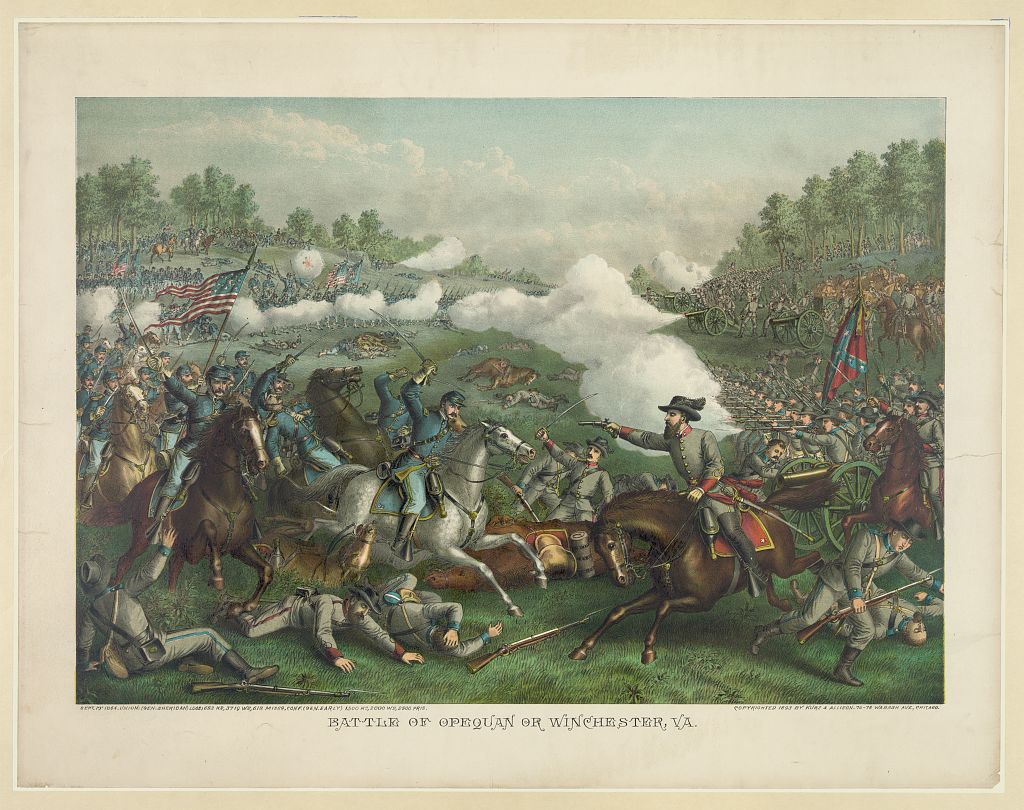 Inflicting heavy casualties during the Battle of Opequan (“Third Winchester”) on 19 September 1864, Sheridan’s gallant blue jackets forced a stunning retreat of Jubal Early’s grays—first to Fisher’s Hill (21-22 September). Then, following a successful early morning flanking attack, they pushed the Rebels back to Waynesboro. These impressive Union victories helped Abraham Lincoln secure his second term as President.