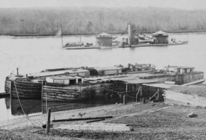 Aiken’s Landing on the James River in Virginia became the site of frequent prisoner exchanges between the Union and Confederacy during the American Civil War. In 1864, the double-turreted, ironclad monitor USS Onondaga, was photographed as it passed by the landing (public domain; click to enlarge).