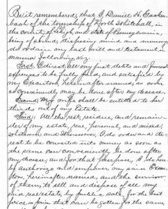 Final will of Daniel H. Gackenbach, August 1909 (excerpt, page one, public domain; click to enlarge).