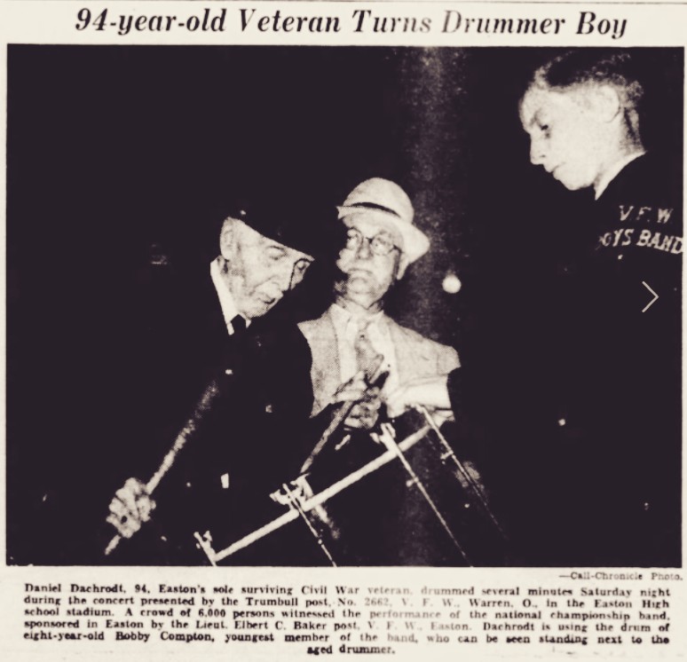 Roughly eighteen months later, Daniel Dachrodt was photographed by Allentown’s Morning Call newspaper in August 1939. Described as “Easton’s sole surviving veteran,” he was captured playing a drum during a concert by the Veterans of Foreign Wars’ Trumbull Post (No. 2652) for a crowd of six thousand attendees at the Easton High School football stadium.