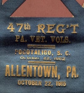 In 1915, the surviving members of the 47th Pennsylvania Veteran Volunteer Infantry paid tribute to William H. Kramer by naming him as the designated honoree for the regiment’s annual reunion that year. The forty-third such gathering of 47th Pennsylvanians, the event was held in the Sons of Veterans’ Hall in Allentown, Lehigh County, Pennsylvania on 22 October 1915 — the fifty-third anniversary of the Battle of Pocotaligo, South Carolina (a battle in which William Kramer had been wounded as a private while serving with the 47th Pennsylvania’s G Company).