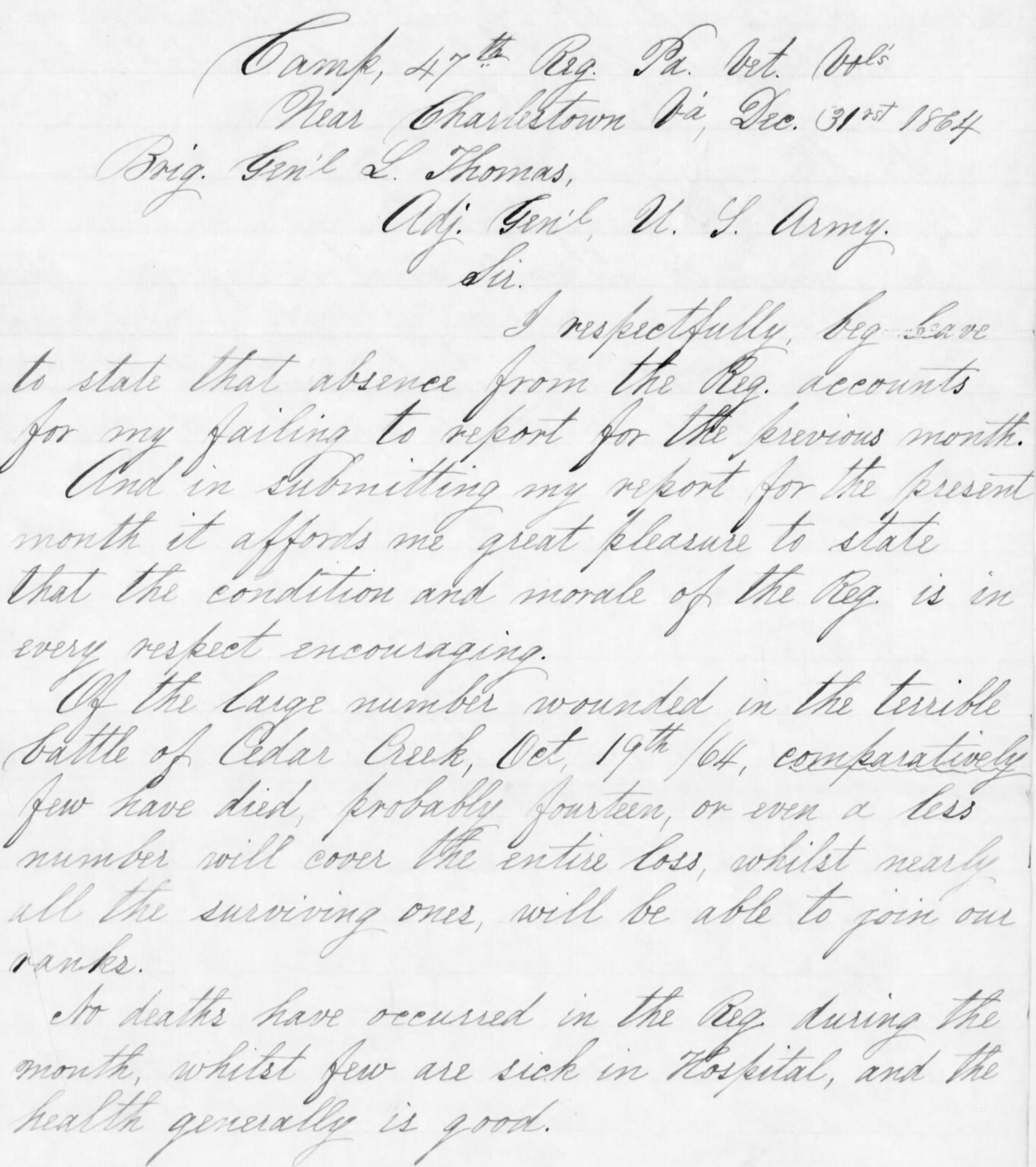 Report of Rev. W.D.C. Rodrock, 47th Pennsylvania Volunteers, post-Battle of Cedar Creek, Virginia (excerpt, 31 December 1864, public domain; double click to enlarge).