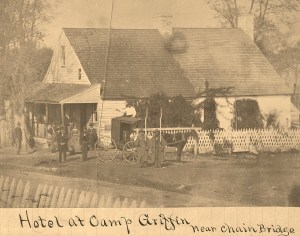 Unidentified guests, hotel at Camp Griffin, Virginia (near the Chain Bridge, c. 1861-62, George Harper Houghton, U.S. Library of Congress, public domain).