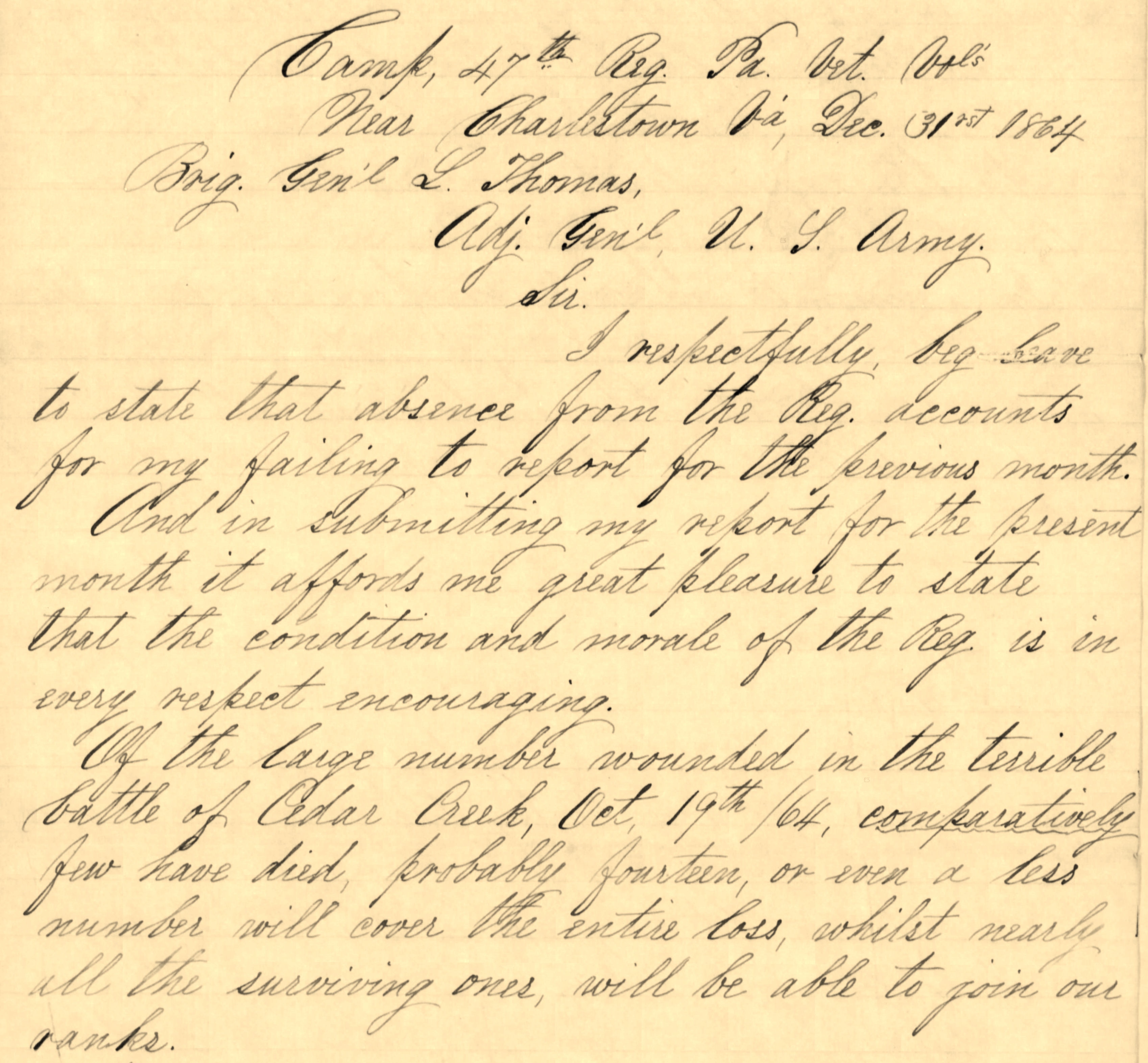 * Note: Chaplain Rodrock’s 31 December 1864 report to superiors had noticeable errors, including his significant underestimation of his regiment’s casualty figures during Sheridan’s 1864 Shenandoah Valley Camapaign. During the Battle of Cedar Creek alone, more than one hundred and seventy-four members of the 47th Pennsylvania were declared killed, wounded, captured, or missing (forty killed in action, ninety-nine wounded in action — fifteen of whom later died, twenty-five captured — ten of whom later died while still being held as POWs or shortly after their release by CSA troops, nine missing, one unresolved). While he may not yet have had full casualty figures by the time he penned the report above, he would certainly have been able to at least obtain accurate figures regarding the number of men who had been killed and mortally wounded.