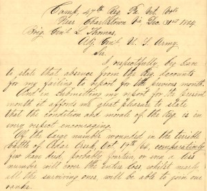 He then went on to report the “health of the Reg. as good” with thirty-seven men on the sick list and the regiment’s “general condition as satisfactory,” adding: