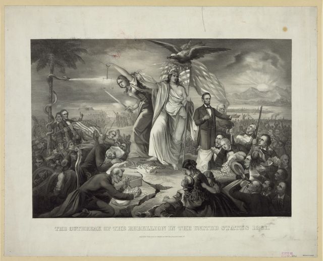 Liberty (center, crowned with laurel wreath and Phryghian cap) is guarded by President Abraham Lincoln (right) and a clear-eyed, sword-wielding figure of Justice (standing without blindfold at left), while President James Buchanan sleeps at the feet of Justice, Buchanan’s secretary of war greedily grasps coins, Confederate President Jefferson Davis stands near a snake-ensnared tree (left), and a sunrise (upper right) offers a glimmer of hope (Charles Kimmel, 1866, U.S. Library of Congress, public domain).