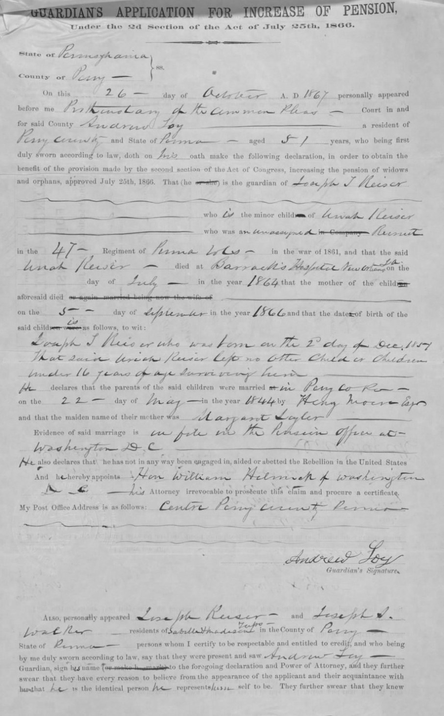 Guardian Joseph T. Keiser’s 26 Oct 1867 Petition to Increase the U.S. Civil War Orphans’ Pension for Private Uriah Keiser’s Children (U.S. Civil War Orphans’ Pension Files, U.S. National Archives and Records Administration, public domain).