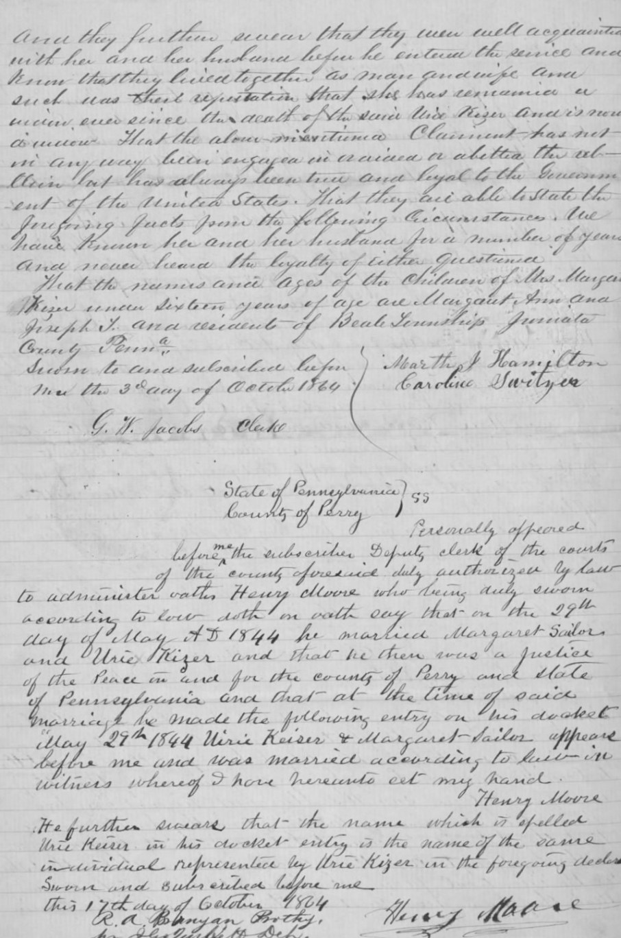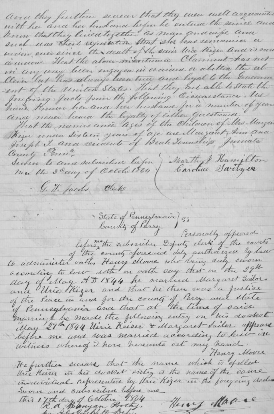 Margaret Sailor Keiser’s Claim for a U.S. Civil War Widow’s and Orphans’ Pension, Margaret’s 3 Oct 1864 Affidavit, p. 2