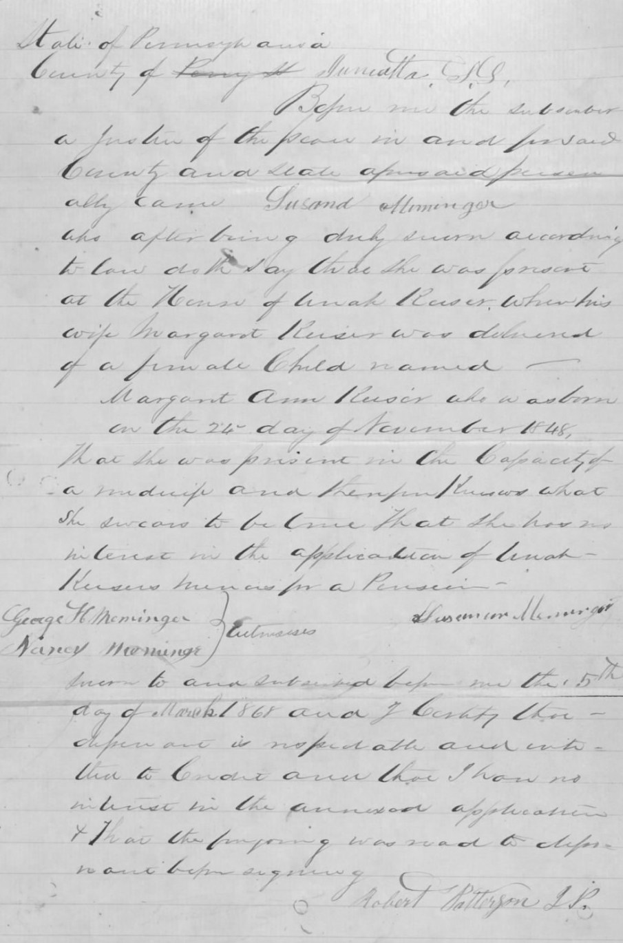 Margaret Sailor Keiser’s Claim for a U.S. Civil War Widow’s and Orphans’ Pension,_Susan Menninger Affidavit, 5 Mar 1868_pubdom