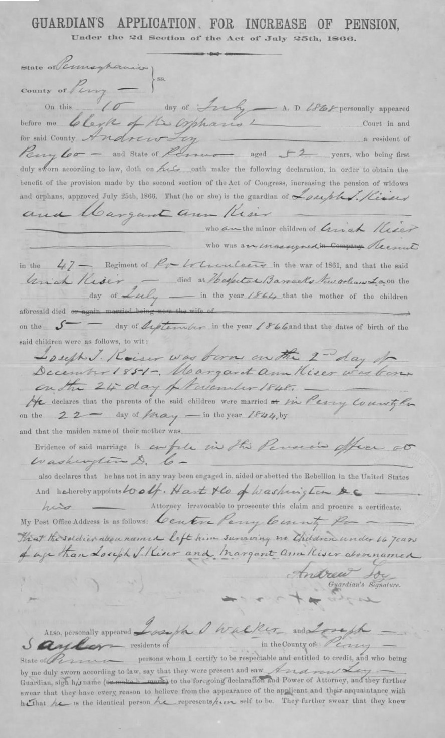 1868 Petition by Guardian Andrew Loy to Increase the U.S. Civil War Orphans’ Pension for Private Uriah Keiser’s Children, p. 1 (U.S. Civil War Orphans’ Pension Files, U.S. National Archives and Records Administration, public domain).